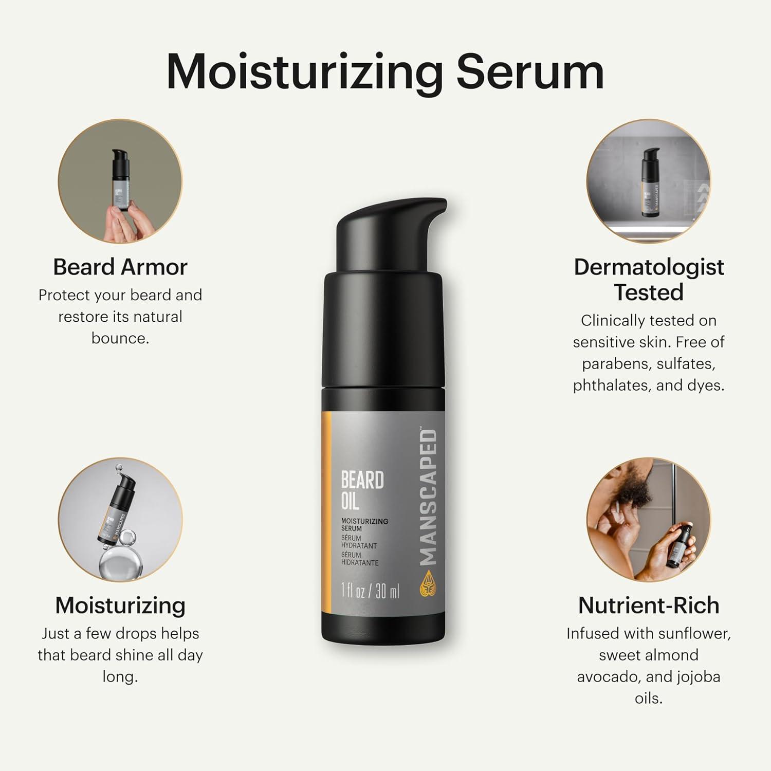 MANSCAPED® Beard Oil, Moisturizing Serum with Jojoba Seed, Sunflower, Sweet Almond Oils for a Nourishing, Hydrating Shine, (1 fl oz) 1-Pack(1 Fl Oz (Pack of 1))