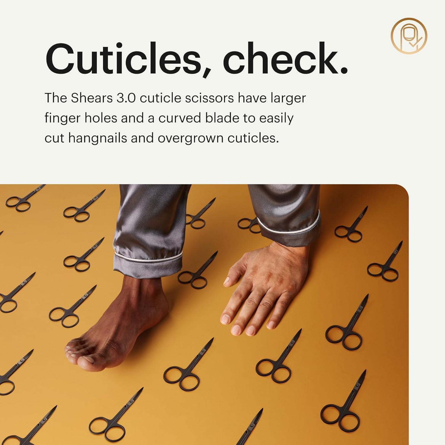 CUTICLES, CHECK: The Shears 3.0 cuticle scissors have larger finger holes and a curved blade to easily cut hangnails and overgrown cuticles.