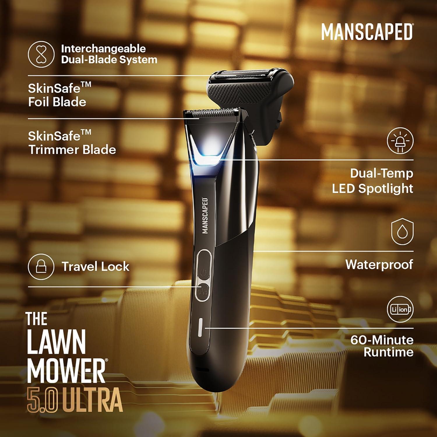 THE LAWN MOWER 5.0 ULTRA: Includes two Interchangeable SkinSafe Blade Heads: A Trimmer Blade & Foil Blade. One fixed-length comb at 1.4mm and two adjustable combs ranging from 2-12mm, power adapter, USB-C cable, and a travel pouch. Our trimmer is USB-C and wireless charging compatible.